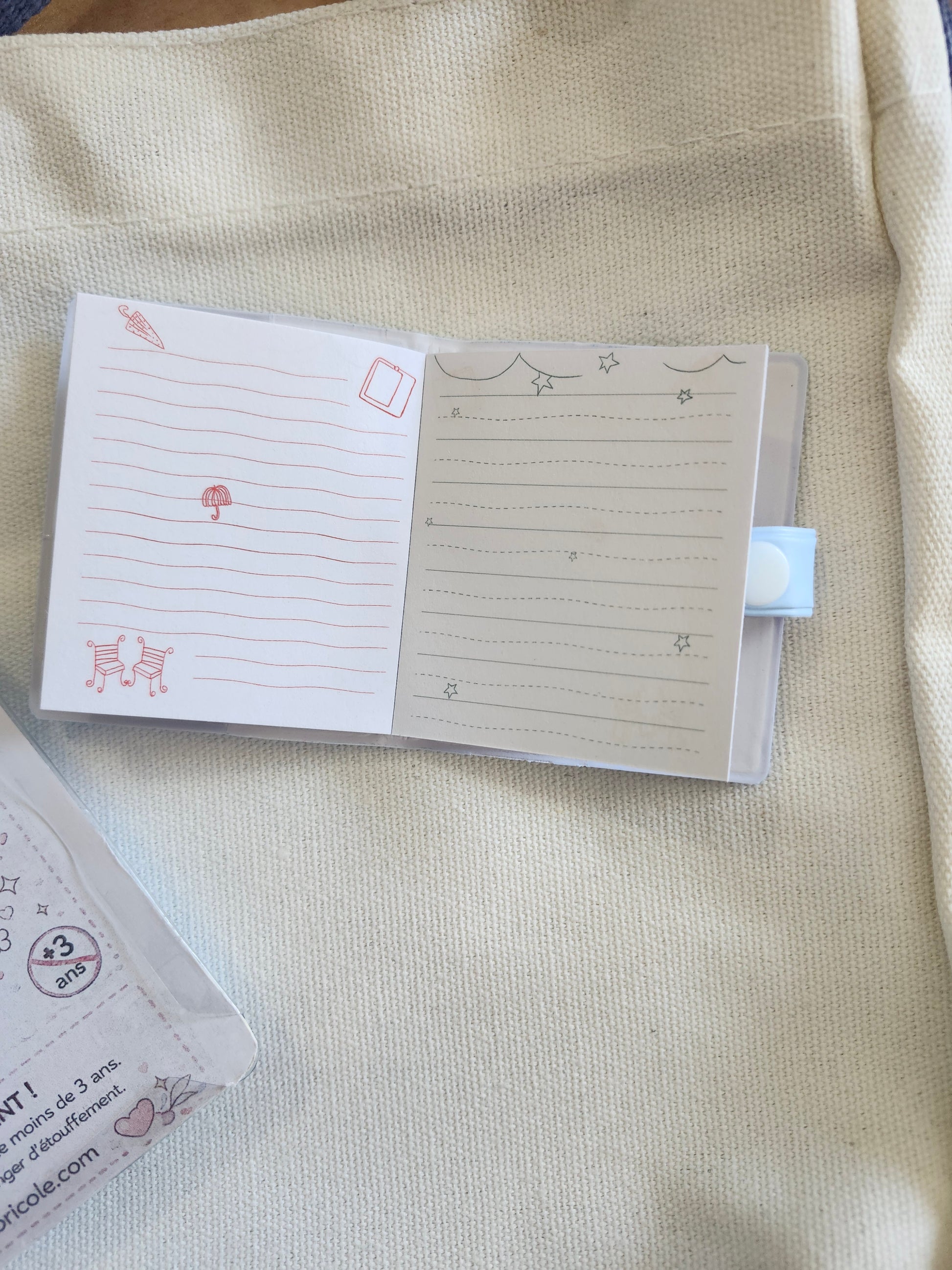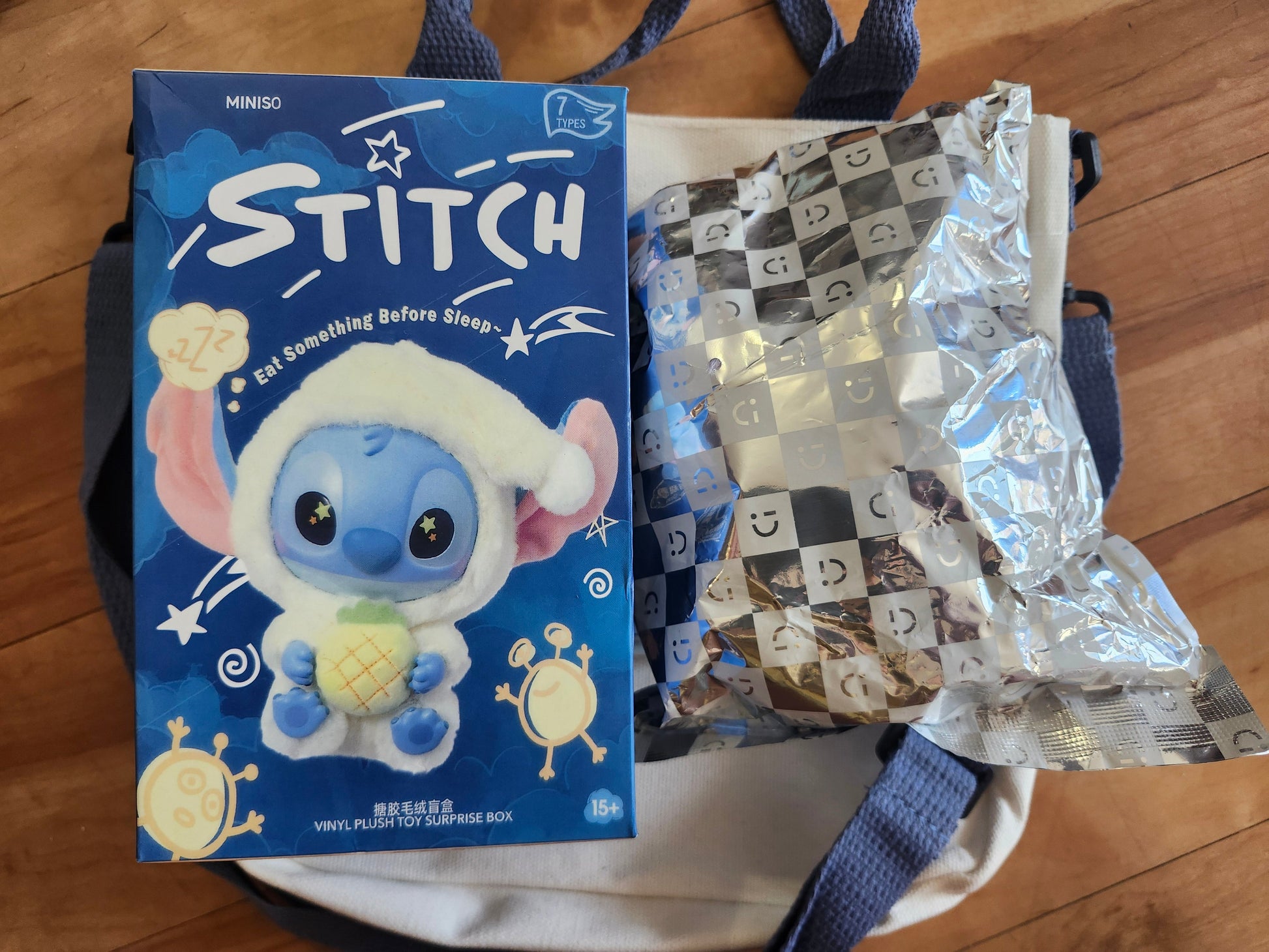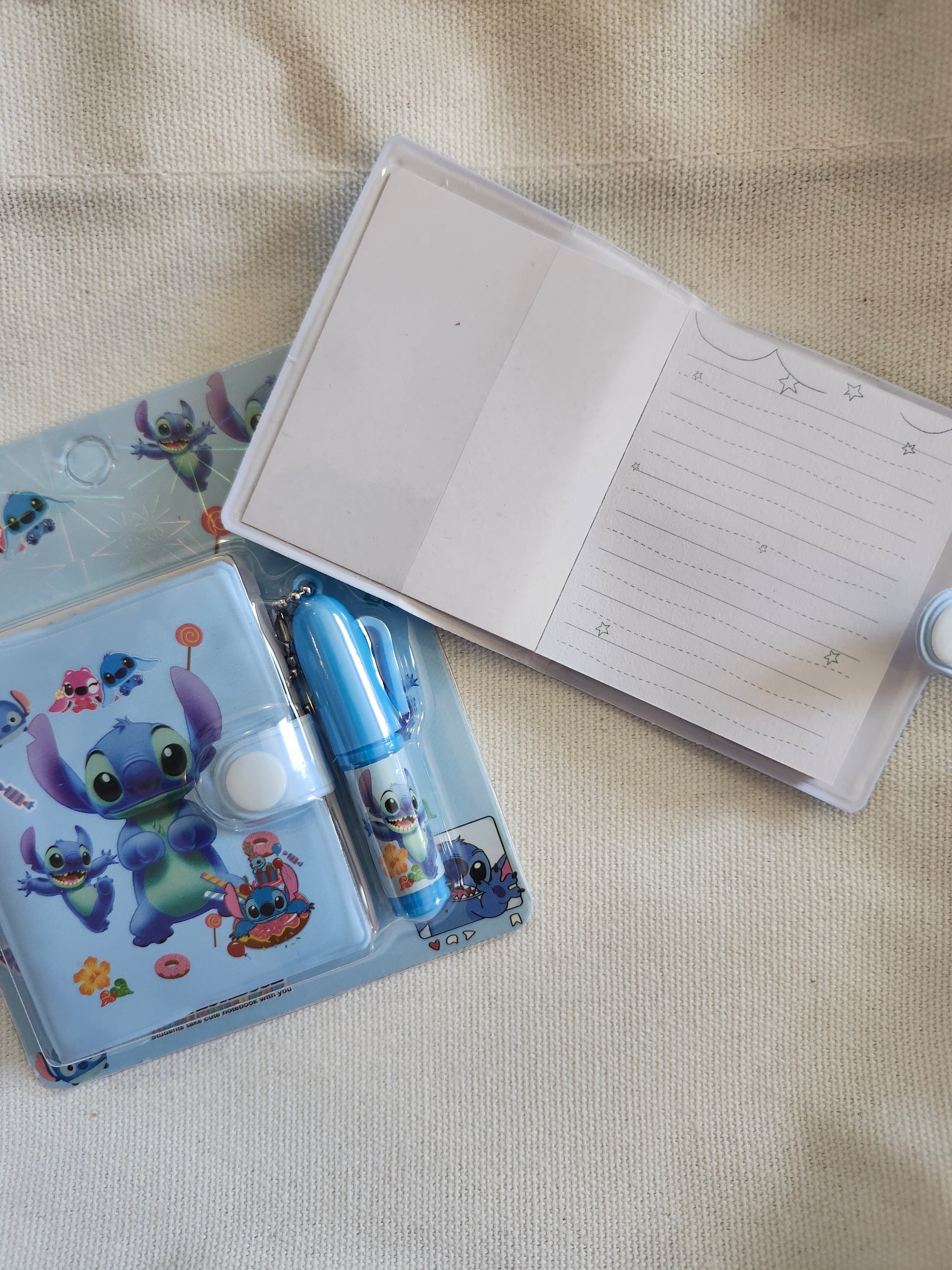 Sac surprise incluant un lafufu stitch, porte clé, tableau effaçable, mini carnet et son stylo, petit journal et un étui très grand pouvant contenir le tout!